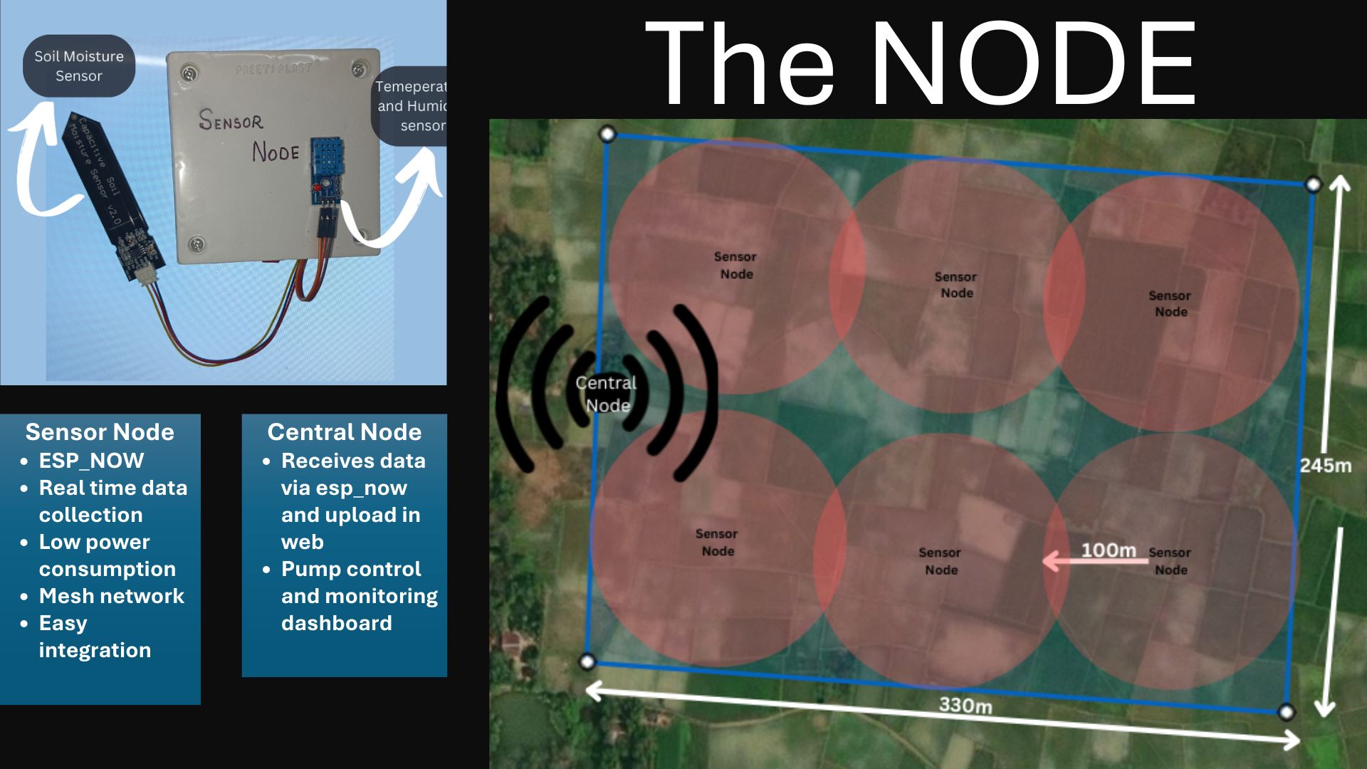 - Sensor Nodes: Collect moisture, temperature, light data; transmit wirelessly using ESP-NOW.