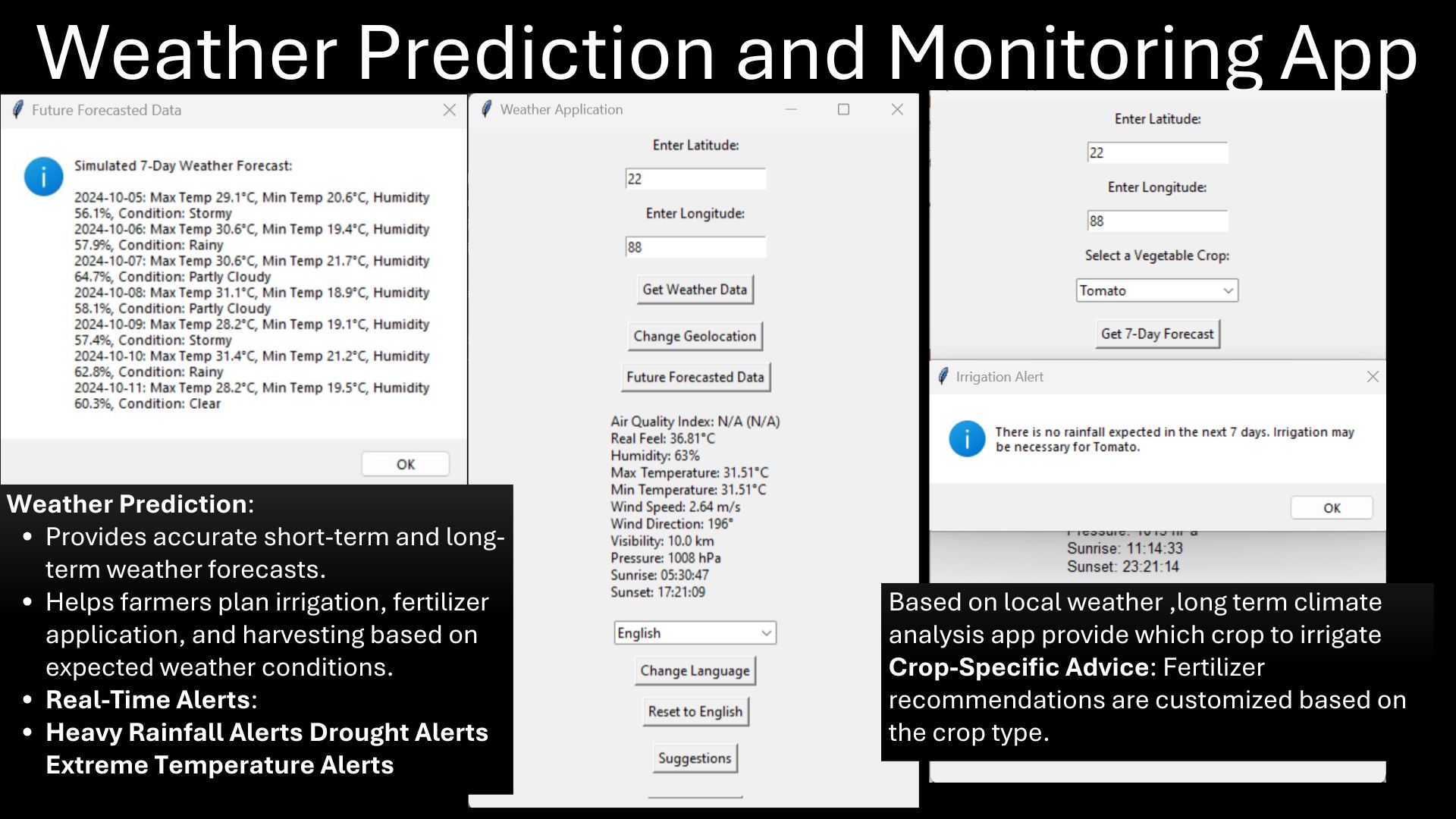 - Weather-Integrated Alerts: Rainfall/drought warnings via forecast APIs.