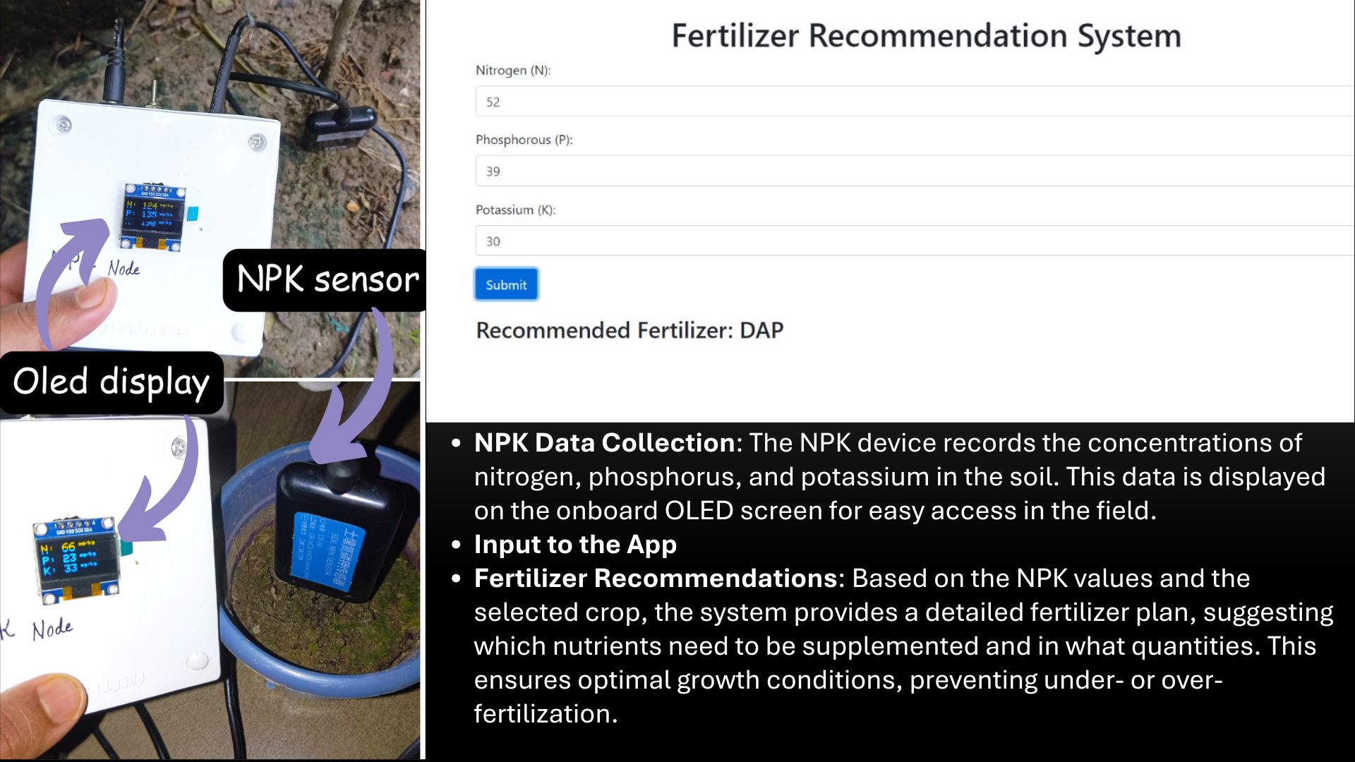 - NPK Node: Measures Nitrogen, Phosphorus, and Potassium; displays data on an OLED; sends nutrient data to base station.